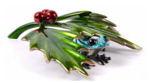 A multi-hued blue. patterned frog, framed by a radiant, gold-toned heart, gazes inquisitively – uncertain as to what he might find-but clearly, infatuated. The lustrous, black toned inner rim of the heart, along with the presence of the pink Cotterill ladybugs, adds texture and warmth to the tableau. “Infatuation” brilliantly captures the essence of Valentine’s Day.